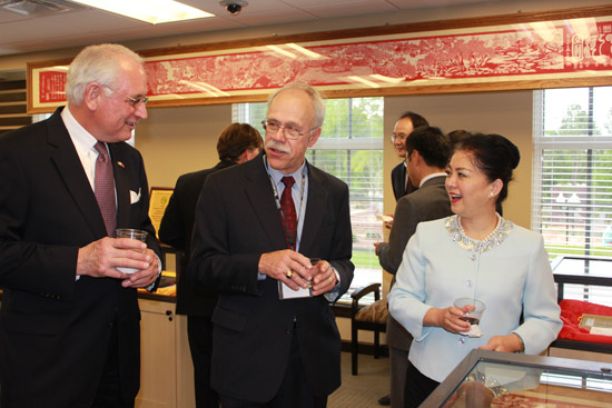 中国驻休斯敦总领事馆许尔文总领事与特洛伊大学霍金斯校长和波特副校长在特洛伊孔院展厅愉快交谈