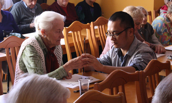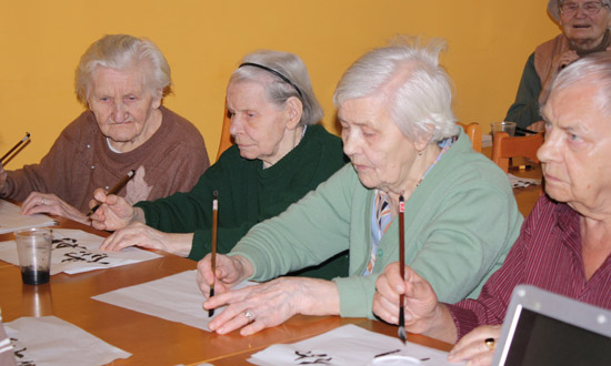 第二个节目是书法学习。志愿者老师郭建峰先通过电脑幻灯展示了中国书法艺术以及对人的修身养性潜在功能,然后手把手地教老人们学写毛笔字,亲身体会中国书法的魅力。老人们一个个面前铺着白纸,手里拿着毛笔,认认真真地写起了毛笔字。有的老人不仅学会了写一二三这些简单的汉字,还学会了说中文的你好,谢谢,再见!