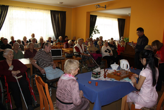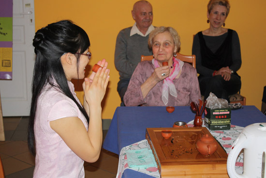 为这次活动,孔子学院共准备了三个节目。在优美动听的一曲《高山流水》的音乐声中,中方院长张礼龙老师用熟练的波兰语开始向大家介绍历史悠久的中国茶文化,然后随着志愿者陈腊梅老师上台表演茶道,再把具体的步骤做了一一讲解,并邀请了两位观众上台参与品茗。表演者与参与者配合得天衣无缝,整个过程如行云流水,轻松活泼而又庄重典雅。茶香四溢,老人们看得兴趣盎然,品得津津有味。