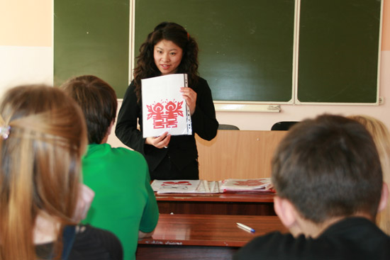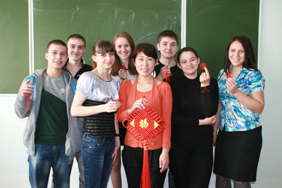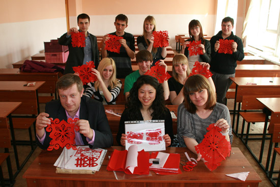 2012年4月19日,俄罗斯布拉戈维申斯克国立师范大学孔子学院在远东国立农业大学举办了中俄国际文化交流节活动,孔子学院教师并分别向俄罗斯大学生展示中国剪纸艺术和中国结编织技术。在老师的细心指导下,一幅幅美丽的剪纸作品和中国结在同学们的手中诞生了。望着自己创作的作品,大家脸上露出了喜悦的笑容。