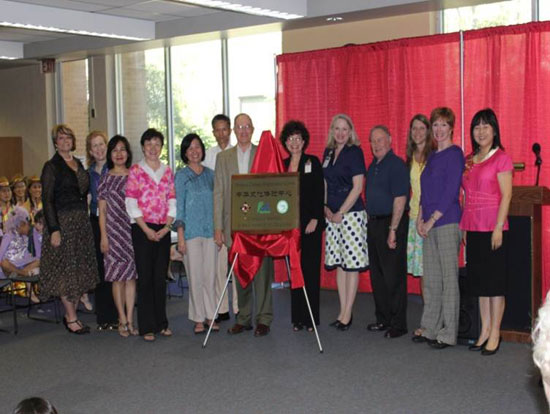 3时,仪式正式开始。先锋公立图书馆系统(Pioneer Library System) 总负责人Anne Masters、俄大孔院院长苟学红、俄大副教务长兼文理学院院长Paul Bell、市图书馆负责人Nancy LittleJohn等,先后发表热情洋溢的讲话。图书馆负责人对中华文化体验中心在这里举办表示欢迎。苟院长介绍了文化体验中心展示的内容。Dean Bell的讲话用中文开场,别有风味,引来阵阵笑声。随后,在热列的掌声中,Dean Bell 和Anne Masters共同为“俄克拉荷马大学孔子学院中华文化体验中心”揭牌。