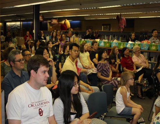 简短的仪式之后,是人们企盼的中华文化表演。诺曼高中新获汉办留学基金的学生Bradley Quy主持节目。中国留学生的古筝弹奏,像清泉叮咚,行云流水;小学和幼儿园孩子的舞蹈《小燕子》,把春天小鸟的欢快和雀跃带到人间;市民女子舞蹈队的民族舞《康定情歌》,原汁原味,旖旎多姿;第十一届"汉语桥"世界大学生中文比赛美南地区预赛俄克拉荷马州选拔赛金奖获得者女大学生毛娜娜 (Brianna Hair) 的独唱,表达了她对中国的特殊情感。最后是太极班学员的太极表演,学员身着黑衣玄裳,颇具古风,一招一式,认真到位。观众席上容不了那么多的人,人们就站在两旁的书架边,欣赏中国人和外国人一起表演的、丰富多彩的中华文化。