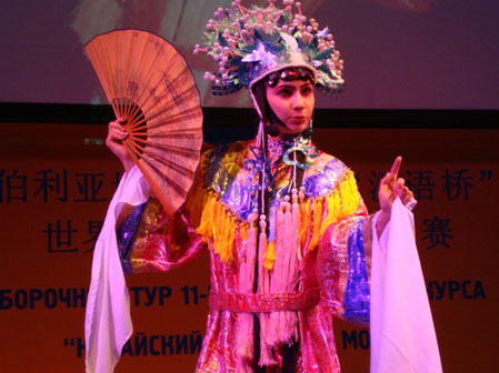 此次比赛共设三个环节,第一个环节是才艺展示。此次参赛选手都进行了精心的准备,展示了丰富的才艺和高水平的汉语技能。有的选手表演的是京剧,有的选手表演的是京韵大鼓,有的选手配合着自导自演的MTV现场演绎了深情的歌曲……,选手们独具匠心的才艺和精彩的表演,让现场的中国和俄罗斯的同学们惊叹连连!