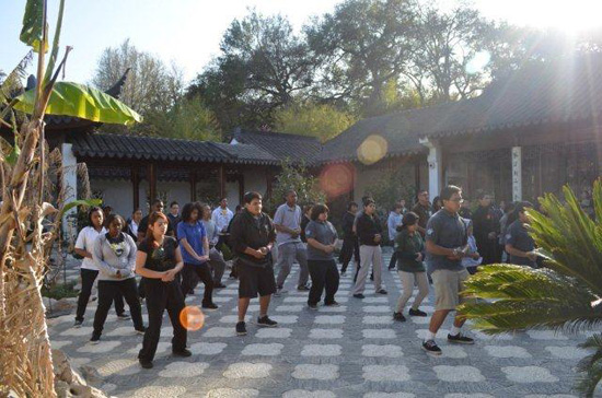 诗歌模仿写作的环节结束后,学生们分成几个小组参观“流芳园”。我们提醒学生们在参观园林的过程中,要充分利用自己感官来感受“流芳园”的色彩、气味和声音,真正领略中国园林艺术的美。学生们仔细观察了“流芳园”中的亭台、楼阁、小桥、石子小路、窗饰等,体验这些不但精致、实用,而且充满美感的景致。学生们还知道了水的永动性和岩石的永恒性,正是这两者之间动静关系构成了”流芳园”的和谐,达到了阴阳的平衡。他们还学习了植物和花卉在中国文化中的象征意义,比如说,桃花象征春天,松枝象征冬天,荷花象征纯洁无暇,竹子象征刚正清廉等。参观活动结束前,洛杉矶少林武术中心的宗健美老师还带领大家学习了太极拳。所有这些都让学生们感受到了中国文化的丰富多彩,给他们留下了难以磨灭的印象。