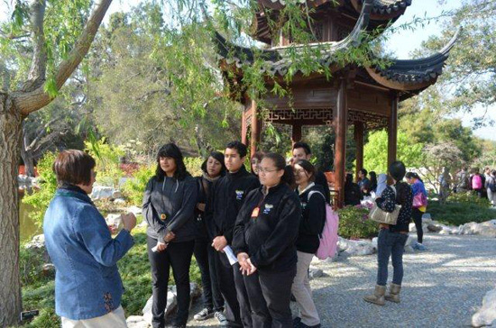 洛加大孔院为科比.布莱恩特基金会创办的全明星课后学校提供汉语课程教学已经进入第三个年头。为了让在全明球星课后学校学习汉语的美国中学生进一步了解中国文化,提高他们的汉语交际水平,近日,洛加大孔子学院组织这些学生参观了位于洛杉矶著名的亨廷顿图书馆内的中国古典园林——“流芳园”。“流芳园”是目前美国最大的中国古典式园林,由中国苏州园林设计院设计并建造,2008年正式开门迎客。园内小桥流水,曲径通幽,充分体现了中国园林动静结合、移步换景等特点,有着浓郁的中国文化氛围,吸引了许多美国游客前去参观,已经成为洛杉矶地区的一个新旅游景点。