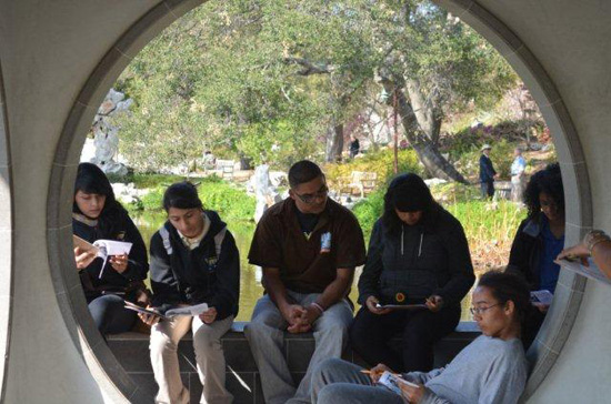 为了避免参观活动走马观花、流于形式,洛加大孔院事前联系了亨廷顿图书馆志愿者项目主管Mikki Heydorff,、教育部副主任Kitty Connolly和植物园的教育主管Rachel Vourlas,希望他们为学生设计最有意义的参观路线,并在参观过程中给予讲解,让学生们对中国文化有一个更为直观的印象。亨廷顿图书馆方面也非常重视,为这次参观做了精心的安排。学生们进入”流芳园”后,Mikki Heydorff简要介绍了“流芳园”的建造过程,在讲解时她特别强调了“流芳园”的诗情画意和艺术价值,正因为如此,“流芳园”已经成为众多艺术家研习诗歌、绘画和书法的地点之一。随后她谈到了中国诗人是如何用诗歌和对联表达他们从“流芳园”中获得的灵感,而这种灵感的表达从来不是直接的,总是通过自然元素体现出来,即中国人常说的“借景抒情”。Mikki Heydorff还分析了中国诗句和对联的结构,并要求学生们借助辅导书籍中的图片和文字,尝试着自己写作诗歌和对联。对此,学生们表现出了浓厚的兴趣,立即动手写作,写作过程中还不断地相互切磋,分享各自的诗歌习作。从学生们交上来的习作看,虽然他们都是用英语写作,但是已经初步理解了中国诗歌创作中的对仗、押韵等基本要求,真可以称之为是“入门”之作了。