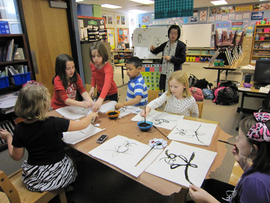 Dixie 小学的中文项目开设于2007年,最初只有幼儿园的小朋友学中文,此后每年增加一个年级,目前幼儿园至四年级的学生,每两天有半个小时的中文学习。而对于从未学过中文的五年级学生来说,艺术节是他们体验中国文化的最好时机。因此在这次艺术节上,肯大孔院的周老师就带领五年级的师生操练武术,并给大家表演了剑术。师生们对中国武术表现出浓厚兴趣,被周老师的精湛技艺所折服。而季老师则展示了她的简易中国画,并带领学生一步步画出了威武的狮子和跳动的青蛙。学生们自豪地相互欣赏着各自的第一幅中国画。