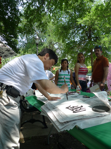 5月5日上午9点,UTD孔子学院由中方院长率领的汉语教师和志愿者一行6人早早地就来到了文化节现场—哈格特公园,开始了精心的展示布置。中国灯笼高挂、中国结迎风飘扬、中国书法作品传达和谐精神;孔子学院介绍、孔子学院课程安排、各种汉语水平考试宣传册、合作院校宣传品、中国剪纸作品、笔墨纸砚摆满展示台,可谓玲琅满目,吸引了大量游客。大家身着孔子学院体恤衫,迎接各方宾客,介绍UTD孔子学院和合作院校,介绍孔子学院宗旨和汉语课程。剪纸艺术展示更是应接不暇,有些中小学生还操起剪刀,在老师的指导下实践这种具有魅力的制作艺术,然后在剪纸作品上写上自己的中国名字,满意而归。一些中国文化爱好者,对古老而一直传承的中国书法艺术情有独钟,不但驻足观看田教授的书法展示,欣赏这一独特的视觉艺术魅力,还为身边的孩童求取中文名字的书法,对英语字母变成中文名的艺术符号赞叹不已。田教授同时将载有和谐思想的书法作品赠送给这些中国文化爱好者,达到宣传和谐社会、世界和平以及全球生态文明建设的理念。