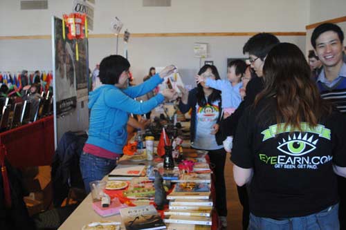一楼的由中国留学生协会和蒙大拿孔院共同设立的中国美食展台,人声鼎沸。美食包括春卷,素炒面和扬州炒饭等。人们纷纷排起长队,等待品尝真正的中国美食。