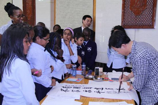 李凌院长为布拉伊本国际小学师生展示中国书法