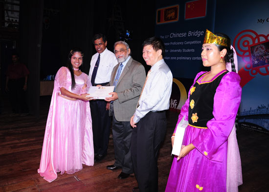 赛后举行的颁奖礼上我驻斯大使馆文化处主任一秘沈鸣先生、凯拉尼亚大学副校长萨拉特•阿姆努伽玛教授、前教育部教育司司长南德塞纳•马德望阿拉吉先生、国际台广播孔子课堂理事会副主席阿马拉基瓦先生、凯拉尼亚大学人文学院院长拉克什曼•塞纳维拉特那教授、现代语言学系主任赫曼达•斯里赛纳、凯拉尼亚大学孔子学院中方院长侯万春、国际台广播孔子课堂中方负责人孙佳佳等嘉宾向获奖选手颁发了获奖证书和汉语学习书籍。