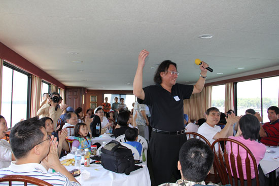 在演讲中,孙禹先生结合他二十年多年游历欧美的坎坷经历,讲述了他为实现自己的音乐和文学创作的梦想所付出的艰辛和努力(图片二:孙禹先生正在作演讲)。孙禹展现了极强的幽默天赋和作为艺术家的超凡表现力,在座的一百五十多名来自亚城各界的华人华侨代表深受感染,游船里爆发出一阵阵的掌声和笑声。应大家的要求,他还在现场演唱了《在银色的月光下》《乡音乡情》《滚滚长江东逝水》《共和国之恋》等经典歌曲,将这次活动推向了高潮(图片三:孙禹先生的演唱,将现场气氛推向了高潮),人们几乎忘记了欣赏舷窗外旖旎的风光,完全陶醉在他富有激情和感染力的歌声中。