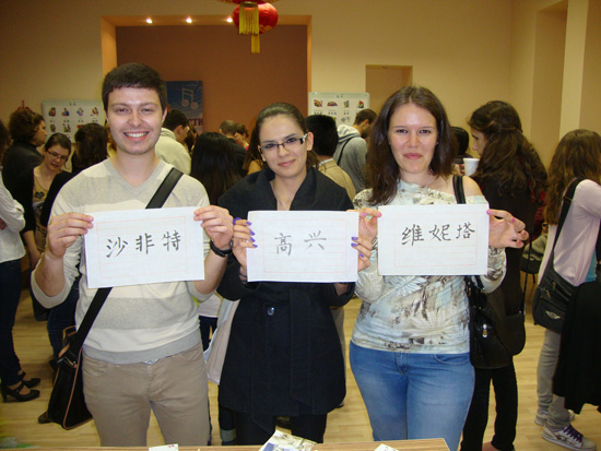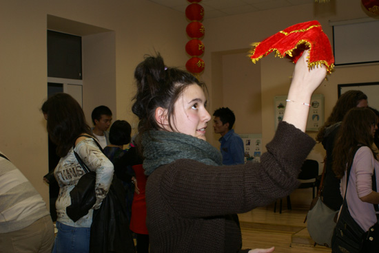 跟着中国老师学习中国剪纸,红红的“喜”字,漂亮的窗花,学会的人拿着自己的作品兴奋不已。在写毛笔字的桌子面前甚至排起了长队,大家都想知道自己的名字用汉字如何书写,已经拿到名字的人如获至宝,珍之又重的收起来。场地中间,题毽子的人群中不时发出欢呼声,有一位保加利亚学生把二人转的手绢转得得心应手,赢得了阵阵掌声。这些都显示了中国文化无法抵挡的魅力。