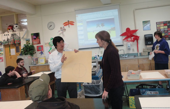 把文化的经典元素穿插到语言学习中,不仅能够吸引学生学习汉语兴趣和热情,而且还能使中华文化中的精华在学生中广泛传播。恰逢阳春三月,在课堂活动中引入中国文化经典元素——沙燕风筝和长串龙骨风筝适逢其时。经过与艺术教师Sally的协商,蒙大拿大学孔子学院Sentinel高中教学点将中国文化和汉语教学融入该校美术课程。