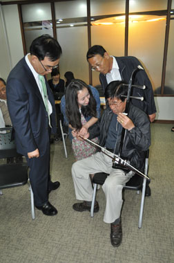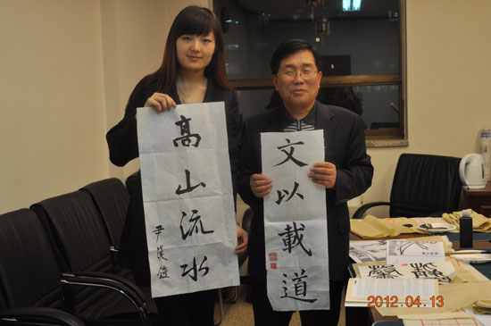2012年春季学期为校长班安排了文化体验课程,包括中国书法体验、中国歌曲学习、中国传统乐器——二胡鉴赏和体验、中国茶文化体验。每一项文化体验都由具有该项专业知识和技能的汉语教师担任讲师,保证将中国传统文化尽可能准确和完美地展现给学员们。校长班的学员大都属于中老年人,他们对中国传统文化有一定的了解和兴趣,由于韩国传统文化跟中国传统文化有很多相近之处,学员们在心理上和情感上很容易并且乐于接受。书法对于韩国人来说并不陌生,因此在中国书法体验课上,学员们在进行书法练习时能够较好地掌握中国书法的基本要领,甚至有些学员写出非常漂亮的汉字书法作品;中国歌曲学习课上,讲师选择了《茉莉花》、《吉祥三宝》、《朋友》几首歌词简单易学、曲调朗朗上口的中国歌曲,学员们在了解中国文化的同时也因歌词而学到新的汉语知识;二胡在跨文化交流中逐渐展现出东方小提琴的重要地位,因此我院将二胡作为中国传统乐器的代表纳入校长班的文化体验课程中来,讲师现场进行二胡表演,并向学员们讲解了二胡的相关知识,最后让学员们亲自体验,甚至在短时间内学会了二胡的基本音符;茶艺是非常能够代表中国传统文化的一种艺术,讲师为学员们讲解了中国最主要的几种茗茶和茶艺所需要的主要茶器,展示了茶的几种泡法,并让学员们对茶进行品评,一方面让学员进一步了解中国的茶文化,另一方面,在对茶的品评中也帮助学员们练习了运用汉语进行交际的能力。