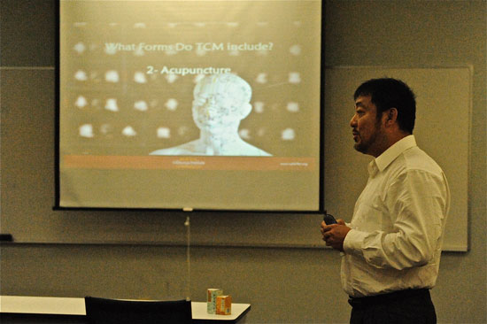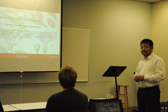 传统中医包括中草药疗法(Holism )、针灸(Acupuncture)、推拿(Massage)、气功练习(Qigong Exercise)、食疗养生法(Dietary Therapy)等几大方面。闫院长介绍了两味传统中成药(traditional Chinese medicine formula)——六味地黄丸和金匮肾气丸。 在谈到气功时,闫院长以他多年修炼养生气功的经验向听众介绍气功对人体养生保健的益处;他还特别与听众分享了他对“气”理论的独到见解, “气”除了是一种物质和能量,还具有哲学意义, “气”与艺术、商业都有其密切的内在联系,“气”还和西方心理学理论中的“情感智力”(EmotionalIntelligence)紧密相关,这种“气”的理论是鲜为人知的。