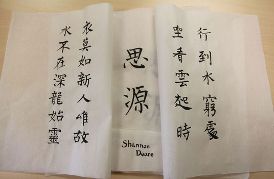 如果Kristin说她是“懒惰”的学生,那Shannon绝对是最勤奋的学生之一,两个月以来,她几乎不落课,每次的作业都很认真地完成。花这么多的时间在书法课上,但其实她不是闲人,除了圣玛丽大学的计算机网络维护工作外,她周末还要教空手道,她的油画更是小有成就,已参加过一些展览。当问及她书法能写得如此出色是否与她以前的油画练习有关时,她说:“现在我练的楷书,一点点临摹,与当时学油画是一样的,可能以后学行书草书就不同吧。”虽说是临摹,但其实她每学一个字,都会问字里面的涵义,最后一堂课里,瑞梅让每个人挑选几个自己喜欢的字时,她认真地问每一句诗每一个成语的意思。她的名字Shannon是一条爱尔兰河流,一直想要个中文名字的她,在理解了“思源”的意思后,她欣然接受这个词作为她的中文名字。在清秀的笔迹下,笔锋的提顿藏露都利用得恰到好处,两个月的书法学习后,她对书法从懵懂到理解,当得知瑞梅是中国画出身后,便强烈建议开书画班。现在,她正想着怎么样从中国订购宣纸和毛笔。