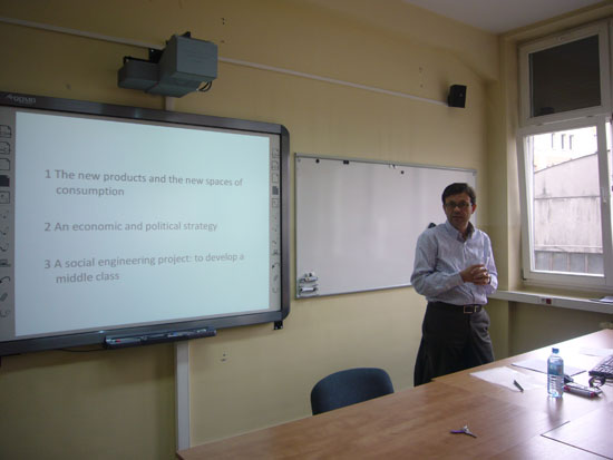 在2012年6月1日的““中国的消费社会”为题的文化讲座中,吉尔斯•吉厄教授则从二十世纪50年代、70年代、80年代、90年代及进入二十一世纪后的不同“三大件“内涵谈起,继而以上海南京路的变迁为题材,详细介绍了中国改革开放后商品经济的发展历程,并论述了中国小康社会的建设、拉动国内消费内需和中国中产阶级的崛起等课题。