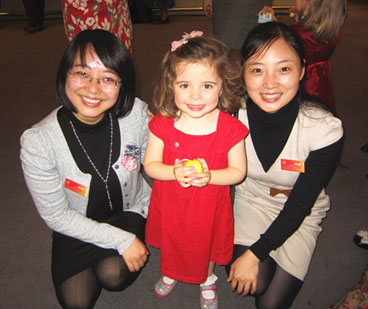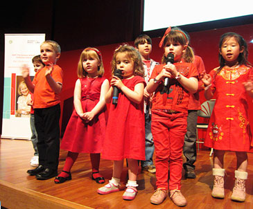早在年会开始前的一个多月时间里,Tiger School的准小学生们就在家长的陪同下学唱中文歌了,这些孩子年纪特别小,都只有四岁。记得刚刚开始时,很多孩子都是躲在妈妈怀里学唱的,慢慢地,这群“老虎小学”的“小老虎”们能从妈妈的臂弯下走出来了,能够跟着汉办老师大胆地唱、欢快地跳了。年会上,面对几百观众,我们可爱的孩子们在台上,像小老虎一样,生龙活虎,唱着《两只老虎》和《数鸭子》,轰动全场,实在是让人惊叹!台下,孩子的家长也为自己孩子精彩的表演激动不已,泪流满面。演出结束后,这群“小老虎”顿时变成了会场的小明星。