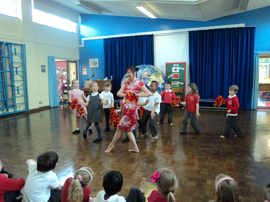 两位汉办老师首先各自表演了太极扇和民族舞,让孩子们领略了极具中国特色的表演。孩子们很喜欢摆弄太极扇和民族舞的帕子,纷纷模仿着老师的姿势。