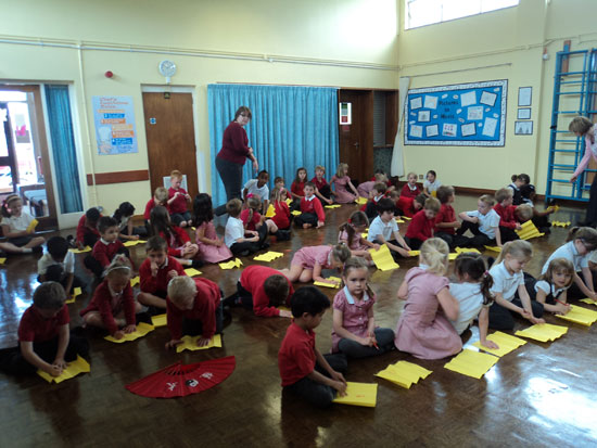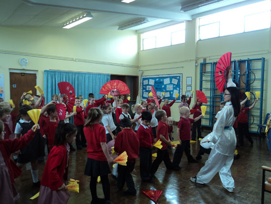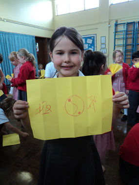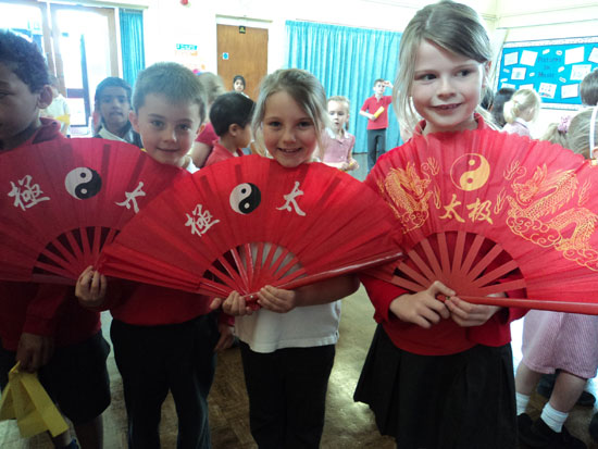 由于学生较多,现有的太极扇数量满足不了孩子们的需求,他们就自己制作了简单的扇子,并在扇子上画上太极符号,中国国旗,甚至写上些许简单的中国字。这样一来,学生们可以依次地尝试使用真正的太极扇。