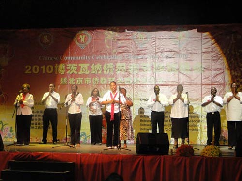 博茨瓦纳大学孔子学院合唱团先以一首温馨感人的手语歌“感恩的心”打动了在场的每一位观众。他们深情而标准的手语动作及他们悦耳动听的歌喉,让台下的掌声一浪高过一浪。随后合唱团又载歌载舞为大家表演了温暖而又脍炙人口的那首“常回家看看”,赢得了台下不断的掌声!许多华人观众激动地站起来,与合唱团一起高唱,台下成了掌声的海洋,欢乐的海洋!