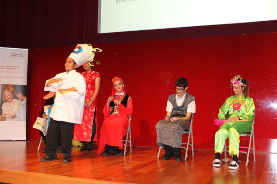 金斯福德社区学校的中文老师们别具匠心,独具一格地将多种中国文化元素融于一个五分钟的话剧中,以四大名著之一《西游记》中的孙悟空和猪八戒为主线,巧妙地将中国传统服饰-旗袍,少数民族服饰,民族歌舞,文学,教育,书法,京剧脸谱,古诗,中华美食等完美结合,演出形式新颖独特,采用和借鉴了当前最流行的相亲节目形式,给观众耳目一新的感觉。