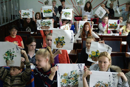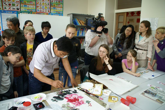6月9日,来自大连的8位画家在国立美术馆和孔子学院为美术爱好者及中小学生共举办了三场公开课演示,各位艺术家现场展示绘画及剪纸技巧,来自当地艺术学院的学生们兴致勃勃地模仿,并当场在画家的指点下完成了自己的中国画作品。参加当天公开课和参观展览的人数约在200余人左右。