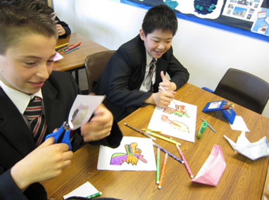 了解粽子、香囊和端午有关的物品的制作过程。让学生们选择一种最适合他们的活动表现形式,经过激烈的讨论,最后同学们一致决定做龙舟。一只只美丽的龙舟从学生们的手中游出来,不比速度,比美丽。