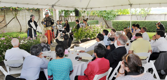 在南俄勒冈国际研讨会上,天津市青年京剧团在风景如画的葡萄园为参会人员演出红鬓马选段《武家坡》