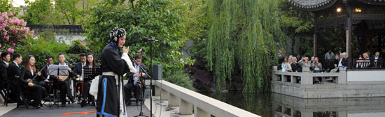 在庆祝波特兰玫瑰节开幕的首场演出中,天津市青年京剧团在波特兰美丽的苏州园林“兰苏园”演出红鬓马选段《武家坡》