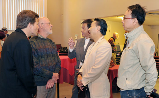 莎士比亚戏剧节艺术总监Bill Rauch、首席执行官Paul Nicholson,天津绿松石科技发展公司总裁石武、天津市青年京剧团团长李少波、执行经理陈鹏一起亲切交谈