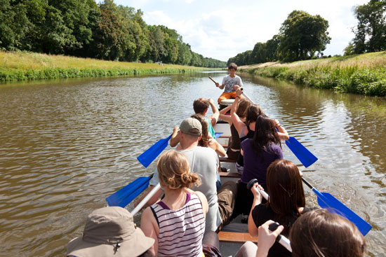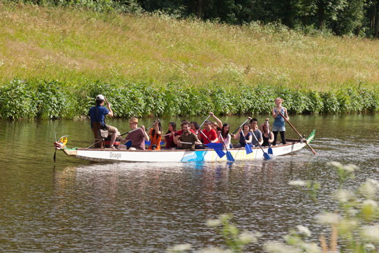 端午节那天,莱比锡迎来了难得的晴朗天气,气温适中,微风送爽,埃尔斯特河(Elster)边景色格外迷人。下午3点半,“划龙舟”活动正式开始。划船者都按鼓点划桨,击鼓者击得快,众人就划得快,大家齐心协力划呀、划呀……按照音乐节奏的优雅鼓点,中德语伴们齐声唱起了“让我们荡起双浆”这首传遍中国大江南北的青少年歌曲,孔子院长院长助理徐磊高唱富有节奏的德国船员歌曲“汉堡的四帆船”,激起了大家的高昂热情,划桨的声音听似更加有力。