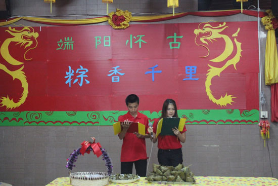 在知识竞赛环节,学员们学以致用,情绪高涨,特别是在抢答环节,大家你争我抢,唯恐落后。抢答结束后,孔院的老师们为大家呈上由学员们亲手包的端午节传统美食——粽子,而此时,两位新学员也上台为大家带来了一段配乐诗朗诵——《端午,倾诉与怀念》。皓月当空,品粽怀古,粽香愈浓,回味无穷。