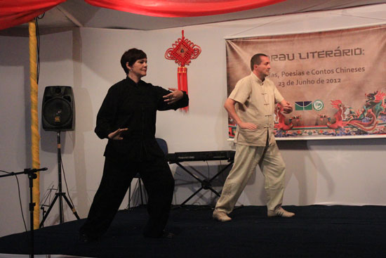 巴西利亚太极拳培训社的两位学员,随着音乐的节拍,以不凡的功底表演了二十四式太极拳,赢得全场掌声。