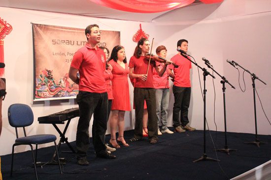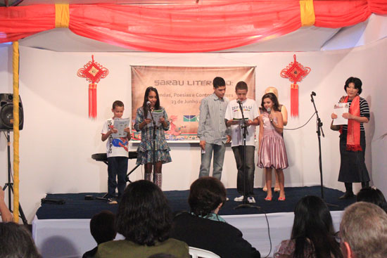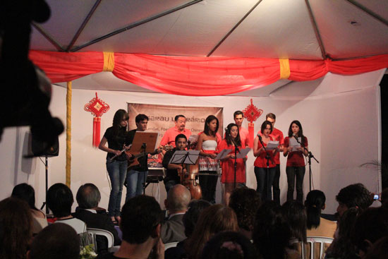 中国驻巴西使馆文化参赞郑柯军出席晚会,随他一起来的年轻外交官刘英和顾斯炜以精彩的表演为晚会助阵,他们分别吟诵了王昌龄的诗作《出塞》和讲述了神话《白蛇传》。