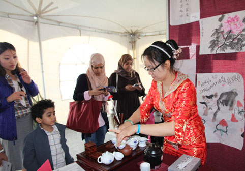 展台开放后,游客从两侧而来,许多人窃窃私语自己的生肖,更多的人为展台前工作人员举止吸引——一身中国旗袍或者一袭中国红很容易就闪吸引到了游客的眼球。我们开始泡茶,立刻就有人过来观看,他们对我们泡茶工具和工序都充满好奇,我们一边泡茶一边跟他们闲聊中国的名茶和茶艺,有人问喝茶有什么好处,有人问为什么我们的茶杯那么小,有人问茶盘里的工具各有什么作用,有人问中国人喜欢喝什么茶……等他们喝完后,他们都问我们茶叶多少钱,能不能买我们的茶具,可惜我们不是茶商。