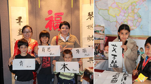 在等着喝茶的片刻,有人注意到我们身后的书画,孔子学院教师便开始用中国的笔墨纸砚写字给他们看,这一开始,两天半的展览中我们就再也停不下来了——他们要写中国名字或者一句她/他想对朋友或亲人说的话,他们说要挂在房间里或者裱在相框中,游客络绎不绝,排成长队等候。我们除了给他们写外,也鼓励他们自己拿起毛笔写自己想写的内容,他们一笔一笔地临摹,满意也写在脸上。