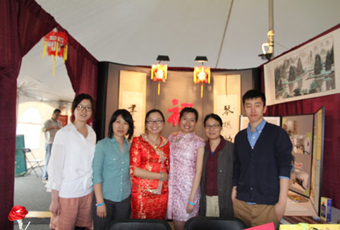 “圣玛丽大学孔子学院”展台是吸引最多游客的展台之一。玫瑰红的帷幕半掩半开,里面看起来像是一个传统的中国新房,只是里面不是住着新人,而是摆挂着具有中国特色的物品:书籍、笛子、葫芦丝、中国书画、笔墨纸砚、剪纸、中国结和绣球、灯笼、扇子等等我们从中国带来的“雅致”,当然还有关于孔子学院和孔子学院课程介绍的展板,以往课程的图片也是很大的一个亮点。帷幕侧面贴着十二生肖的介绍,圣玛丽大学孔子学院的横幅挂在展台的正前方。如果说展台正中的书法对联“琴棋助雅兴、书画伴遐想”给展台增添了文气,那么对联中间的“福”字则平添了些许的“喜气”。
