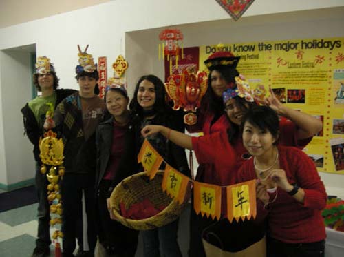 2月12日是春节前最后一个周五,一大早,汉语班师生们就装扮一新,前往各个教室为全校学生派发红包,为每个老师送去精心制作的灯笼及挂饰,并送去“新年快乐”的祝福。当天,在Alma高中任教的中国老师还带领全班学生头戴可爱的老虎头饰,手拿中国结,向全体学生派发红包,向每个老师赠送灯笼及挂饰。每进一个教室,由一名学生介绍中国新年:今年是中国的虎年,如何互相拜年,为何发红包,红包上面的字念什么等,然后老师带着学生说:“新年好”,引发了所有老师和学生的极大兴趣。下课后,学校走廊里“新年好”的声音不绝于耳。