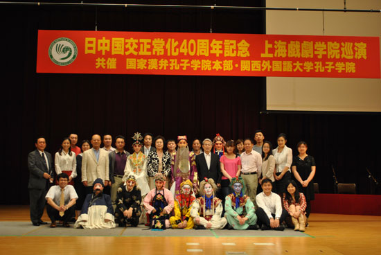 6月26日下午5时,中日邦交正常化40周年京剧巡演——“粉墨中国”在关西外国语大学中宫校区谷本纪念礼堂隆重举行。演出由关西外国语大学孔子学院和上海戏剧学院联合主办。关西外国语大学理事、关西外国语大学孔子学院理事片山智行教授和上海戏剧学院京剧团团长王伯男先生先后致辞,枚方市市长竹内脩先生来电表示祝贺,关西外国语大学理事长、关西外国语大学孔子学院理事长谷本荣子女士到场观看了演出。