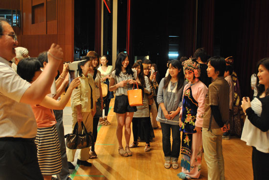 演出结束后,关西外国语大学谷本荣子理事长登上舞台向上海戏剧学院王伯男团长赠送鲜花以示感谢,并与全体演员及相关工作人员合影留念。