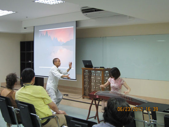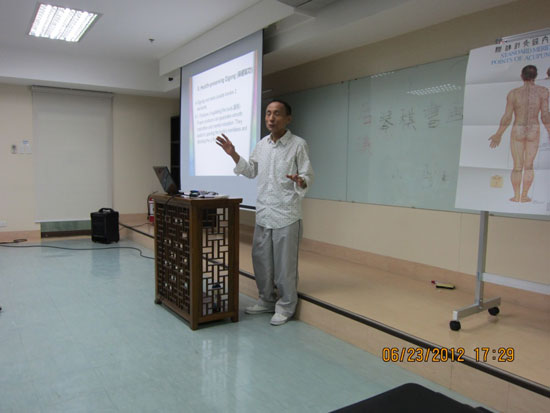 此次主讲人为亚典耀大学孔子学院太极拳教师周宝发,他将讲座分为四个专题,饮食养生、保健气功、太极文化、针灸与自我点穴保健。周老师多年苦心研究中医、气功以及针灸,因此,他深谙中国传统养生文化,可以穿梭其间,讲起养生知识来条理清晰,如数家珍,深入浅出地传播了中国博大精深的养生文化。