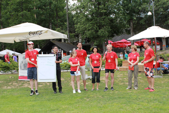 在工作人员的组织和引导下,共有16支队伍参加了划船比赛。经过两轮的激烈竞逐,来自卢布尔雅那的PIJIU队一举夺冠,由国外游客组成的PAKC和卢大汉学专业组织的教师队分获第二名和第三名。张宪一大使、Janez Fajfar市长还为获奖选手颁发了纪念品。