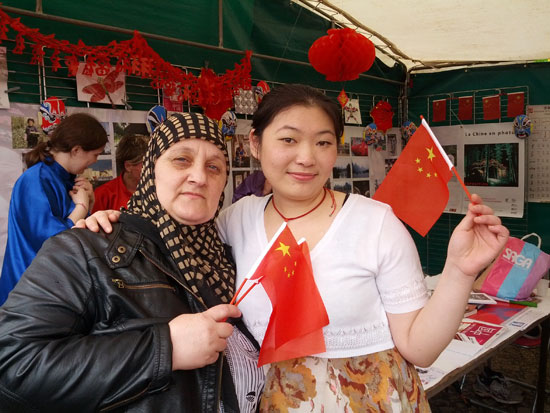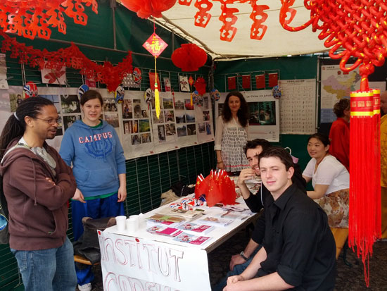 下午两点,活动正式开始。布雷斯特分院负责人Alain Le Gall 教授被邀请到现场舞台上参加与其他语言代表的讨论。孔子学院的汉语教师薛君则在现场专门开设的语言课堂为现场的路人们上了一堂简短的室外汉语课。前来听课的不仅有法国人,还有英国人,澳大利亚人,以及车臣人等等。与汉语课堂遥相呼应的汉语展区内这时已经人头涌动。大家品尝着孔子学院准备的中国香茗,谈论着中国的发展和汉语的魅力。当人们发现用一根看似普通的教棒就能让墙上悬挂的教学挂图“讲话”时,都激动不已,纷纷亲自尝试起这一前所未见的“魔术教具”。一些学过汉语的人更是迫不及待的从挂图上寻找自己认识的汉字来一显身手。每一位从汉语展区离开的观众都获得了一面中国小国旗作为纪念。