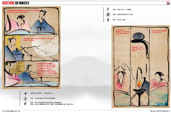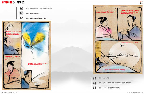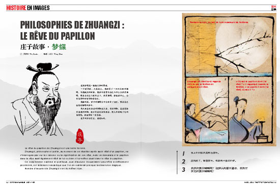 “庄周梦蝶”一文图文并茂,介绍中国古代的哲学家庄子和蝴蝶的故事,作者中国艺术研究院文化学者吴祚来,绘画中央美术学院画家王钊,原文刊载于中法文对照版院刊“图片故事”栏目,刊登之后受到读者喜爱。该文除了被选入2013年法国教育部远程中文教材(纸质教材),电子版将进入法国教育部的“网络校园”(http://www.academie-en-ligne.fr), 方便更多的中文学习者使用这一教学资源。
