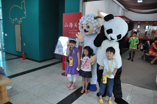 小朋友们在山海关入口处和玩偶的合照。
