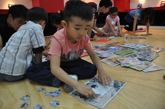 小朋友在认真地拼图。
