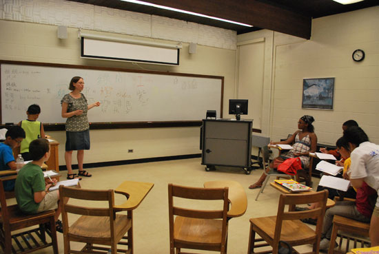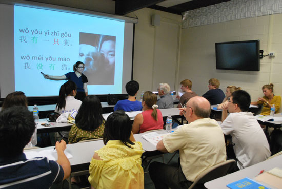 在每天上午的三节汉语课上,瓦大和瓦大孔院教师(侯振德 (Daniel Hoyle)、何安悦 (Anna Horkey)、吴慧卿、王淼)精彩的讲解和灵活的教学方法激发了美国学生学习汉语的浓厚兴趣,学员们或认真听讲,或细心记笔记,或踊跃举手提问,课堂气氛活跃。除了有四位老师主讲,还有来自浙江工业大学对外汉语专业的11位同学,他们在带队蓝汉林老师的指导下,以暑期汉语文化教学实践为主题,全面参与夏令营的教学和文化活动。他们在课后为学员们提供一对一地的辅导,一问一答地练习汉语口语。在文化课和课间休息或午餐时间,浙工大的同学们和美国学员们打成一片,协助开展文化教学活动,帮助学员们掌握所学的语言文化知识。