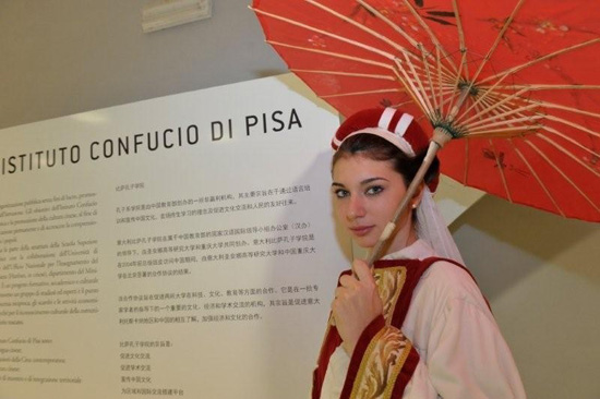 身着意大利古装、举着中国花伞的的蒙特普齐亚诺人在比萨孔子学院的展板前留影